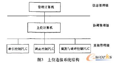 上位連接系統是位于控制中心的一個自動化綜合管理系統。上位計算機通過串行通汛接口與西門子S7—300PLC的串行通訊接口相連,對PLC進行監(jiān)視和管理,構成集中管理、分散控制的分布式多級控制系統。在這個控制系統中,西門子S7.300PLC為直接控制級,負責綜采工作面采煤機各變量的監(jiān)測與控制,同時接受上位計算機傳來的信息和向卜位計算機發(fā)送現場采集的數據。上位計算機是協調管理級,它與下位直接控制級、自身人一機界l面交互層和上級信息管理級進行數據交換,是連接過程控制和信息管理的橋梁。上位計算機與PLC的通訊采用RS232C/RS422通信接口;上位計算機與信息管理計算機的通信采用局域網。