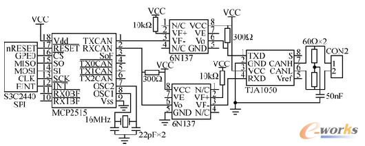 CAN總線接口電路如圖2所示。采用Microchip公司的CAN總線控制器MCP2515。MCP2515完全支持CAN 2.0A/B技術(shù)規(guī)范,速度達到1 Mbps;SPI的接口標準使得它與S3C2440的連接更加簡單;能發(fā)送和接收標準和擴展數(shù)據(jù)幀以及遠程幀;自帶2個驗收屏蔽寄存器和6個驗收濾波寄存器,可以過濾掉不想要的報文,減少了微處理器的開銷。CAN總線收發(fā)器采用TJA1050,該器件提供了CAN控制器與物理總線之間的接口以及對CAN總線的差動發(fā)送和接收功能。