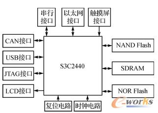 硬件系統(tǒng)以S3C2440為核心,RAM內(nèi)存、NOR Flash和NAND Flash作為存儲介質(zhì),擴展部分外圍設(shè)備以負責系統(tǒng)信息的輸入與輸出,如CAN總線通信單元、LCD顯示、觸摸屏、通用串行口、USB設(shè)備、以太網(wǎng)接口等。系統(tǒng)硬件結(jié)構(gòu)如圖1所示。