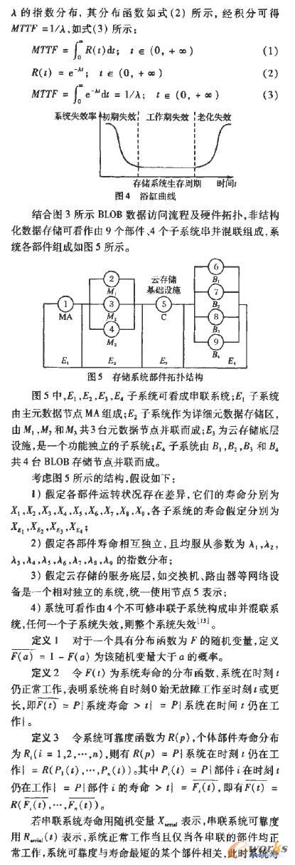 通常,評(píng)估系統(tǒng)的可靠性可從研究系統(tǒng)可用性、失效率和系統(tǒng)生命周期著手,統(tǒng)計(jì)學(xué)經(jīng)常使用圖4所示的“浴缸曲線”描述系統(tǒng)生存周期。由該曲線可知,非結(jié)構(gòu)化數(shù)據(jù)存儲(chǔ)系統(tǒng)生存周期將經(jīng)歷初期失效、工作期失效和老化期失效三個(gè)階段。其中,早期失效和老化期失效服從典型的威布爾分布,而工作期失效則服從參數(shù)為λ的指數(shù)分布,若系統(tǒng)由多部件組成,其部件失效時(shí)間也服從負(fù)指數(shù)分布。本文則重點(diǎn)關(guān)注系統(tǒng)正常工作期的可靠性評(píng)估,并假定系統(tǒng)工作期失效率是恒定的。由曲線可知,系統(tǒng)可靠性與正常工作時(shí)間t有關(guān),若用R(t)表示系統(tǒng)正常工作期的可靠度函數(shù),其參數(shù)t的區(qū)間為(0,+∞),則系統(tǒng)在t時(shí)刻前正常運(yùn)轉(zhuǎn)而無(wú)需維修。事實(shí)上,經(jīng)常使用系統(tǒng)平均無(wú)故障時(shí)間(Mean Time To Failure,MTTF)描述系統(tǒng)可靠性,則MTTF為函數(shù)R(t)在區(qū)間(0,+∞)上的定積分,如式(1)所示。又由R(t)服從參數(shù)為