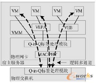作為對(duì)VEPA技術(shù)的加強(qiáng),HP又提出了多通道技術(shù)。多通道技術(shù)支持VEB、VEPA和虛擬機(jī)直接輸入輸出三種流量轉(zhuǎn)發(fā)通道,如圖5所示。為了對(duì)三種通道進(jìn)行區(qū)分,需要給數(shù)據(jù)包添加標(biāo)簽。多通道技術(shù)使用了QinQ(802.1ad中定義),也就是在VLAN Tag標(biāo)簽上(802.1q標(biāo)準(zhǔn))上添加了STag標(biāo)簽,達(dá)到對(duì)通道進(jìn)行區(qū)分的目的。如果相關(guān)的網(wǎng)絡(luò)設(shè)備不支持QinQ處理,也需要進(jìn)行硬件升級(jí)。