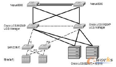 上海市政務(wù)網(wǎng)的公共服務(wù)虛擬共享平臺(tái)采用了思科統(tǒng)一計(jì)算的解決方案,服務(wù)器部分由思科UCS系列的刀片服務(wù)器組成,并由UCSManager對(duì)刀片服務(wù)器硬件進(jìn)行統(tǒng)一管理;虛擬化軟件使用vmwarevSphere,由vCenter對(duì)所有系統(tǒng)和虛擬機(jī)進(jìn)行集中管理;網(wǎng)絡(luò)部分配置思科Nexus5000系列交換機(jī)和Nexus1000V分布式虛擬交換機(jī)。系統(tǒng)結(jié)構(gòu)圖如圖8、圖9所示。