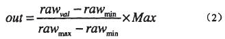 在手套開(kāi)啟和每次更換用戶(hù)后,需要重新設(shè)置并實(shí)時(shí)更新各傳感器原始數(shù)據(jù)。通過(guò)線(xiàn)性的數(shù)學(xué)公式,根據(jù)原始數(shù)據(jù)的最大值和最小值,以及設(shè)定的數(shù)據(jù)取值范圍來(lái)得到獲取數(shù)據(jù)。其公式為: