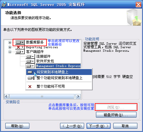 7.選擇所需組件,單擊“數(shù)據(jù)庫服務(wù)”后可以點擊“瀏覽”按鈕,更改安裝路徑
