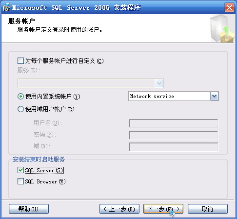 10.配置賬戶服務(wù),定義登錄時使用的賬戶,默認(rèn)設(shè)置即可,單擊下一步