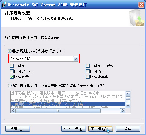 12.設(shè)置排序規(guī)則,默認(rèn)為Chinese_PRC,不更改設(shè)置,下一步即可
