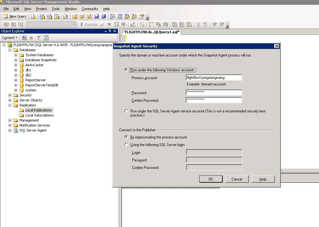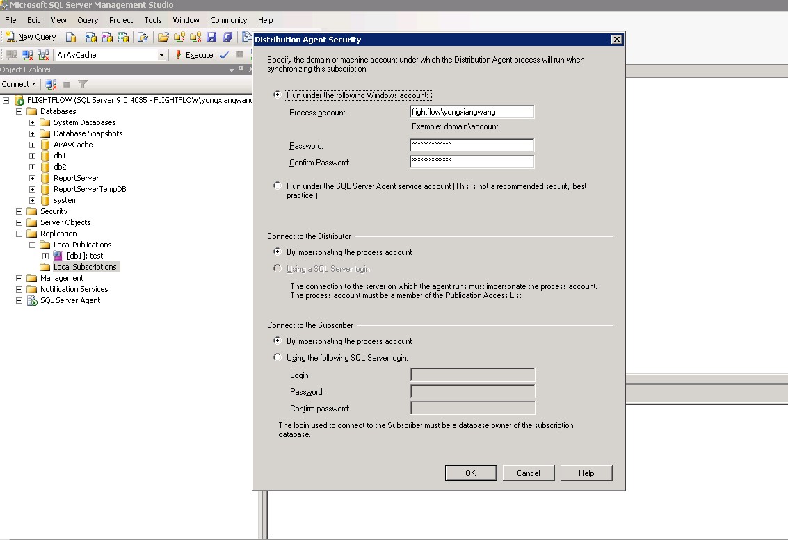 5.設(shè)置復(fù)制代理及安全,即指定可以運(yùn)行代理的用戶帳號(hào)。