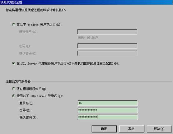 (3)在代理安全性界面,單擊 安全設(shè)置 按鈕,指定將運(yùn)行快照代理進(jìn)程的域或計(jì)算機(jī)帳戶,選擇"在sqlserver代理服務(wù)帳戶下運(yùn)行(這不是我們推薦的最佳安全配置)"