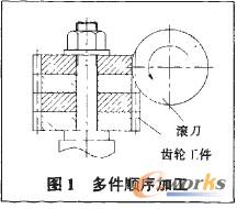 對某些小型零件,可采用多件加工。如圖1所示,一次裝卡加工4個齒輪,既可減少安裝夾緊的輔助時間,也可減少加工時的對刀時間和切人切出時間。