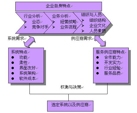在認(rèn)真分析了企業(yè)自身的情況后,企業(yè)將對(duì)軟件系統(tǒng)和供應(yīng)商有了具體的需求,只有滿足這些需求的軟件產(chǎn)品和相應(yīng)的供應(yīng)商才將是企業(yè)的合適選擇。而這些需求將對(duì)應(yīng)于關(guān)于各個(gè)軟件產(chǎn)品和供應(yīng)商特點(diǎn)。對(duì)軟件系統(tǒng)的情況,我們需要關(guān)注的如系統(tǒng)功能、系統(tǒng)柔性、界面友好性、系統(tǒng)架構(gòu)和軟件成本等因素。對(duì)服務(wù)供應(yīng)商的情況,我們需要關(guān)注合作能力、開發(fā)實(shí)力、行業(yè)經(jīng)驗(yàn)、服務(wù)品質(zhì)等因素。這樣企業(yè)就可以選擇出最適合企業(yè)需求的軟件產(chǎn)品和供應(yīng)商。