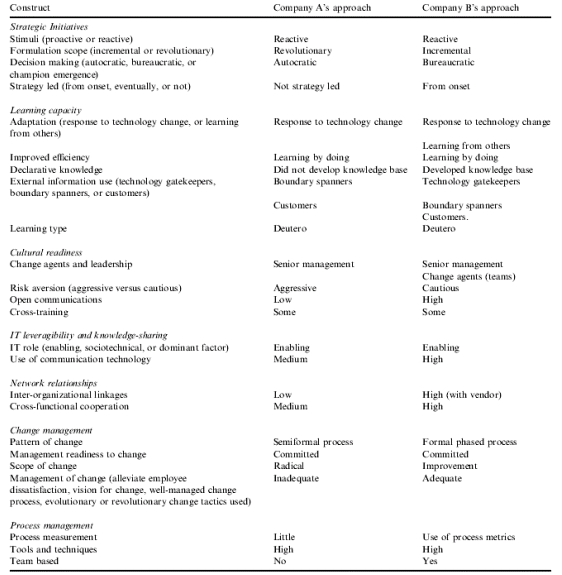 兩個公司都有建立一個可以學習的環(huán)境的想法,這種環(huán)境能對技術(shù)變革作出適當響應,或者能從行業(yè)中取得豐富經(jīng)驗的公司那里學習。然而A公司意識到其它公司的ERP系統(tǒng)的缺陷,這些公司以為他們能在ERP咨詢商,一些培訓和生活系統(tǒng)那里得到幫助而輕松的適應新技術(shù)。但是他們真的低估了新技術(shù)的復雜性。一個最終使用者評論說: