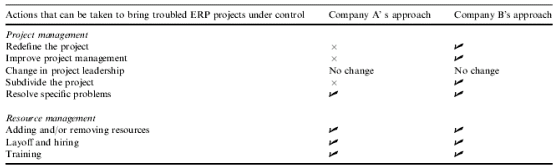 以上的實例分析追蹤了A和B公司實施它們的ERP系統(tǒng)的不同做法?赡蹷公司監(jiān)視項目的方法和確保成功的措施還不是很清楚。這些措施在下面敘述,并總結(jié)在表2中。
