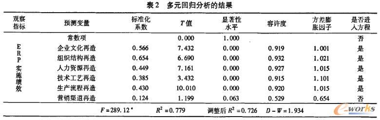 因此,得多元回歸方程如下:ERP實(shí)施成功=0.566企業(yè)文化再造+0.654組織結(jié)構(gòu)再造+0.449人力資源再造+0.385技術(shù)工藝再造+0.430生產(chǎn)流程再造。