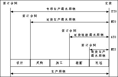 現(xiàn)實中,生產(chǎn)類型的選擇受兩種周期的制約。一種是從同客戶簽訂銷售合同開始,到客戶收到訂購的產(chǎn)品為止的時期,稱之為需求周期,或客戶交貨提前期。另一種是從設(shè)計、生產(chǎn)準備開始到客戶收到貨物為止的時期,稱為生產(chǎn)周期。各種生產(chǎn)類型的需求周期與生產(chǎn)周期的關(guān)系可用圖2來說明。