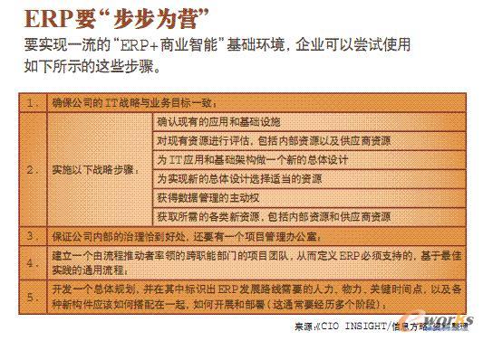 那么,實現(xiàn)一流的“ERP+商業(yè)智能”IT環(huán)境,究竟需要什么樣的路線圖呢?要回答這個問題,你首先必須明白,這個過程是意義非凡,并且充滿曲折的過程,甚至?xí)虼蠛胶0銡v盡波濤起伏。它需要企業(yè)擁有高水準(zhǔn)的管理水平,并作出堅實而持久的承諾。但有一點必須強調(diào)的是,路線圖所涉及的每一步戰(zhàn)略,必須是看得見摸得著而且可執(zhí)行的,更重要的是它們必須是易采納的,因為它們將影響到企業(yè)的幾乎每個部門。