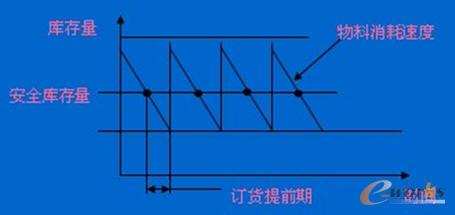 傳統(tǒng)的庫存計劃和控制方法是訂貨點法。訂貨點法又稱訂購點法,是一種在庫存物資由于消費下降到一定數(shù)量(這個數(shù)量稱為訂貨點)時,就派員進行訂貨,以期在庫存耗盡之時所訂物資正好到貨的方法。這種方法的特點是:假定訂貨提前期、市場供應(yīng)、裝運條件是不變的,每次訂貨的批量是相等的,訂貨時間是隨著物資庫存量降到訂貨點時間的不同而變化的。因此,在生產(chǎn)對物資的消耗速度不均衡的情況下,可以利用在訂貨點派人訂貨來適應(yīng)物資消費速度的變化,保持物資儲備的合理性。圖1就是傳統(tǒng)的訂貨點法: