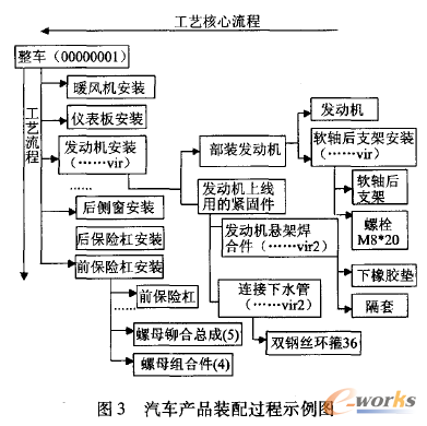 對汽車制造業(yè)來說,MBOM的關(guān)鍵是產(chǎn)品的物料間核心制造裝配。因此,從工藝文件中找到這些物料的核心制造裝配關(guān)系,就可以得到MBOM。這就是基于核心工藝流程構(gòu)造 MBOM的核心思想。其關(guān)鍵在于如何表示產(chǎn)品工藝關(guān)鍵流程。