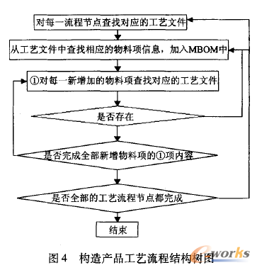 產(chǎn)品工藝流程節(jié)點(diǎn)對應(yīng)著生產(chǎn)中某個或某些物料項(xiàng)。這是因?yàn)楣に嚵鞒坦?jié)點(diǎn)的本質(zhì)是一個或一組工藝過程,這個工藝過程必然要輸出物料項(xiàng)。為了制造這個輸出物料項(xiàng),一定會有若干個輸人物料項(xiàng),這些輸人物料項(xiàng)是上一個工藝流程節(jié)點(diǎn)的輸出物料項(xiàng),或是初始狀態(tài)物料項(xiàng)。因此一個工藝流程節(jié)點(diǎn)必然對應(yīng)著一個物料項(xiàng)。這樣就可以用相應(yīng)的物料項(xiàng)去"替代"工藝流程結(jié)構(gòu)樹中的流程節(jié)點(diǎn),實(shí)現(xiàn)根據(jù)工藝流程節(jié)點(diǎn)所對應(yīng)的工藝數(shù)據(jù),一般指工藝規(guī)程。工藝規(guī)程中的信息表明了該工藝流程所要加工或制造商的物料項(xiàng),而且其編碼是唯一的,可以作為MBOM的節(jié)點(diǎn)。如果是加工工藝規(guī)程,則指明了所需要的原材料或毛坯;如果是裝配工藝規(guī)程,則列舉了為裝配該物料項(xiàng)所需要的其他全部物料項(xiàng)以及相應(yīng)數(shù)量。原則上材料、毛坯和子裝配件都作為該物料項(xiàng)的子節(jié)點(diǎn)出現(xiàn)在MBOM中。通過父子節(jié)點(diǎn)關(guān)系定義子節(jié)點(diǎn)的來源屬性和使用部門。這樣,根據(jù)工藝流程,結(jié)合工藝流程節(jié)點(diǎn)的、工藝信息,就可以構(gòu)造出產(chǎn)品的MBOM,其核心算法如圖4所示。