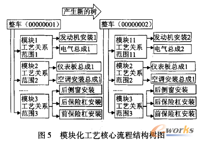 模塊化結(jié)合形成產(chǎn)品制造工藝結(jié)構(gòu)樹,簡化工藝結(jié)構(gòu)樹的管理,根據(jù)模塊間與整車的關(guān)系,利用參照樹的關(guān)系可以重新制造產(chǎn)品結(jié)構(gòu)樹,實(shí)現(xiàn)精益物料與精益工藝的完美統(tǒng)一,如圖5所示。