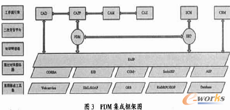 現(xiàn)以某單位為例,介紹PDM 集成。因3 所示為某PDM 集成框架圖,它采用通用組件技術(shù),以企業(yè)應(yīng)用集成乎臺(tái)為支撐,提供開(kāi)放式的通用集成工具集(如工作流引擎、二次開(kāi)發(fā)平臺(tái)、知識(shí)管理器等),將產(chǎn)品設(shè)計(jì)、分析、制造、工藝規(guī)劃和質(zhì)量管理等方面的信息孤島集成在一起,形成貫穿企業(yè)全局的信息流。CAD/CAPP/CAM/CAE系統(tǒng)從PDM 中提取各自所需的信息(如組織、產(chǎn)品數(shù)據(jù)、過(guò)程信息等) ,也可以將設(shè)計(jì)結(jié)果存儲(chǔ)到PDM 中。ERP 借助PDM 的信息橋梁作用疏通與化的信息梗阻。PDM 把設(shè)計(jì)所產(chǎn)生的EBOM(設(shè)計(jì)物流消單)、PBOM(制造物流清單)、Rωtinge 工藝路線)等信息傳遞給ERP系統(tǒng);而ERP 系統(tǒng)中產(chǎn)生的與產(chǎn)品有關(guān)的生產(chǎn)計(jì)劃、材料、維修服務(wù)等信息。也可以被PDM管理、利用、傳遞。如此便可以完成各分系統(tǒng)的集成,實(shí)現(xiàn)制告系統(tǒng)問(wèn)信息互動(dòng)。