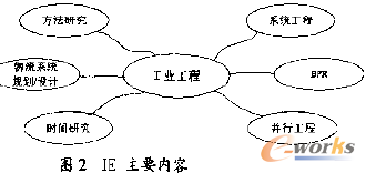 IE (Industrial Engineering)是工業(yè)工程的簡(jiǎn)稱,是對(duì)人員、物料、設(shè)備、信息及能源所組成的集成系統(tǒng),進(jìn)行設(shè)計(jì)、改善和設(shè)置的一門(mén)學(xué)科。IE 的功能具體表現(xiàn)為系統(tǒng)的規(guī)劃、設(shè)計(jì)、評(píng)價(jià)和創(chuàng)新四個(gè)方面。隨著技術(shù)的發(fā)展現(xiàn)代工業(yè)工程是基于系統(tǒng)分析、計(jì)算機(jī)技術(shù)與運(yùn)籌學(xué),用于解決大系統(tǒng)最優(yōu)化與宏觀資源配置,與信息技術(shù)密切相關(guān),其發(fā)展趨勢(shì)表現(xiàn)在兼收并蓄高新技術(shù)理論,注重敏捷、柔韌性、精益、并行制造系統(tǒng)的集成開(kāi)發(fā)和應(yīng)用。其主要內(nèi)容可用圖2表示。
