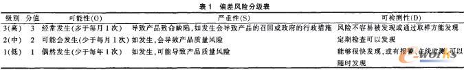 偏差等級的劃分是根據(jù)偏差發(fā)生的可能性、嚴(yán)重性、可檢測性綜合考慮的結(jié)果?赏ㄟ^風(fēng)險(xiǎn)優(yōu)先數(shù)來計(jì)算,風(fēng)險(xiǎn)優(yōu)先數(shù)RPN=O×S×D,其中,0為風(fēng)險(xiǎn)發(fā)生的可能性,S為風(fēng)險(xiǎn)的嚴(yán)重性。D為風(fēng)險(xiǎn)的可檢測性。