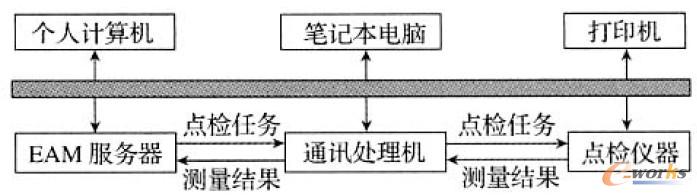 神東點(diǎn)檢管理平臺(tái)是EAM 系統(tǒng)中的一個(gè)模塊。神東EAM系統(tǒng)軟件環(huán)境為:操作系統(tǒng)WindOWs2000 Server ;數(shù)據(jù)庫(kù)Oracle 8.1.7,采用B/S 結(jié)構(gòu)。點(diǎn)檢管理模塊、點(diǎn)檢儀設(shè)備(包括點(diǎn)檢數(shù)據(jù)采集器、測(cè)振儀、油液分析儀、電機(jī)故障檢測(cè)儀、超聲檢測(cè)儀、紅外點(diǎn)溫儀、紅外熱像儀)與EAM 系統(tǒng)集成的系統(tǒng)架構(gòu)如圖1 所示。