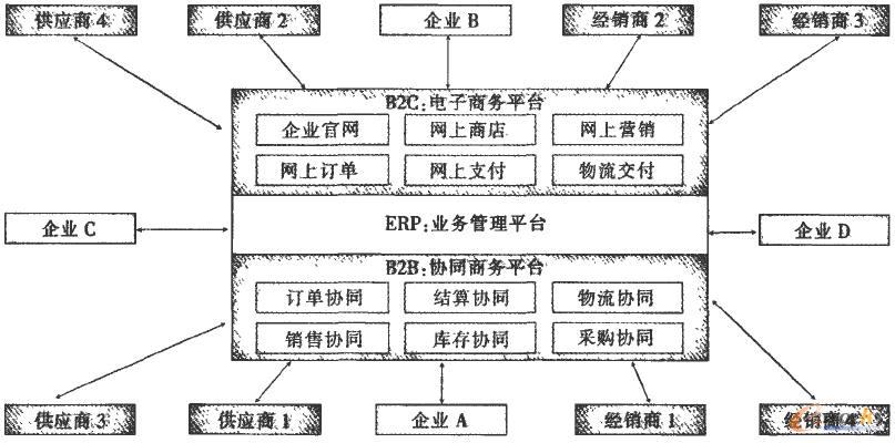 (3)供應鏈網(wǎng)商務協(xié)同。提高關聯(lián)業(yè)務效率,降低關聯(lián)業(yè)務成本。為供應鏈上下游企業(yè)提供商務協(xié)同平臺,實現(xiàn)網(wǎng)上交易,使訂單、產(chǎn)品、物流、支付等數(shù)據(jù)共享。