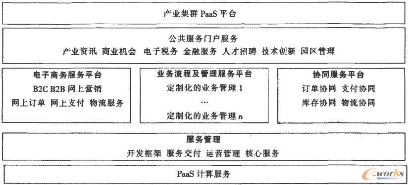 “基于PaaS模式的產(chǎn)業(yè)集群集服務平臺”可分為4個層次,分別是公共服務門戶服務、應用服務、服務管理和PaaS計算服務。