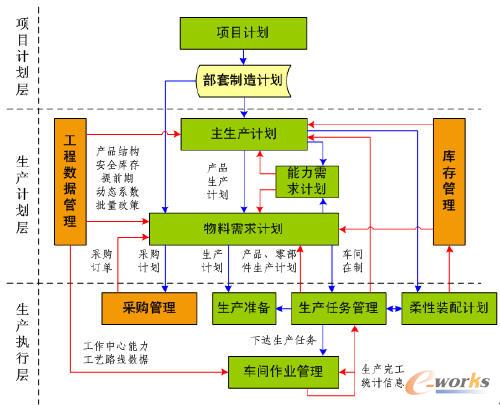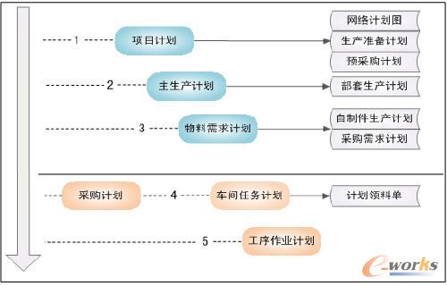 - 第一層:項目計劃部分。根據(jù)項目管理部門編制的項目計劃,分解出涵蓋產(chǎn)出時間及產(chǎn)出數(shù)量的部套產(chǎn)品制造計劃,進入系統(tǒng)形成主生產(chǎn)計劃。