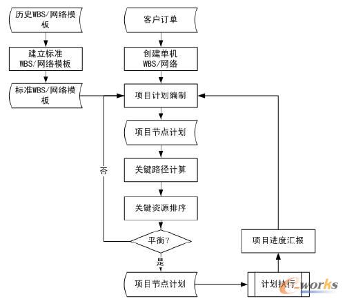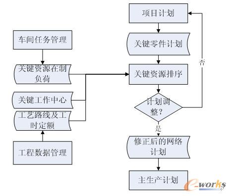 在項目計劃體系中,我們通過WBS和項目網(wǎng)絡計劃,將單機產(chǎn)品拆分到各部套,明確每個部套中對關鍵資源占用零件的開始時間、占用時間、結束時間。作為輸入,從車間任務管理系統(tǒng)中獲取關鍵資源的車間在制負荷,從工程數(shù)據(jù)管理系統(tǒng)中獲取關鍵工作中心能力數(shù)據(jù)和工藝路線及工時定額數(shù)據(jù),新負荷和在制負荷按照一定的優(yōu)先級對關鍵資源進行作業(yè)排序,產(chǎn)生關鍵資源的作業(yè)計劃。這個計劃如果突破了大部套的里程碑計劃則要對項目計劃做出調整,如果計劃可行,大部套設計完成,即轉入主生產(chǎn)計劃。