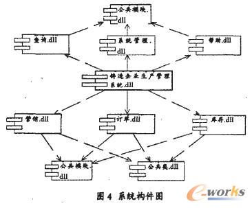 系統(tǒng)實(shí)現(xiàn)的源代碼、二進(jìn)制代碼、可執(zhí)行代碼可以按照模塊化的思想,用組件技術(shù)分別組織起來(lái),明確系統(tǒng)各部分的功能職責(zé)和軟件結(jié)構(gòu)。鑄造企業(yè)生產(chǎn)管理系統(tǒng)的運(yùn)行軟件可以用如圖4所示的組件來(lái)表示。