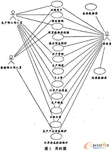 系統(tǒng)管理員登陸后能對(duì)系統(tǒng)進(jìn)行管理和維護(hù),可以添加、刪除和修改用戶名和對(duì)應(yīng)的權(quán)限。同時(shí)系統(tǒng)管理員對(duì)系統(tǒng)的基本信息進(jìn)行設(shè)置,如工人信息、產(chǎn)品信息的編碼。而營(yíng)銷部工作人員和生產(chǎn)部工作人員對(duì)系統(tǒng)的基本信息只能進(jìn)行瀏覽,但其可以對(duì)本部門的信息進(jìn)行對(duì)應(yīng)的添加、刪除和修改。在仔細(xì)的分析了系統(tǒng)的需求分析后,確定了以上三個(gè)執(zhí)行者,并設(shè)計(jì)出了如圖1的用例圖,從該圖可以明確的了解該系統(tǒng)的需求。