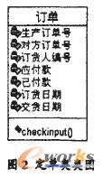 靜態(tài)建模的結(jié)果是建立邏輯視圖,主要包括類圖和對(duì)象圖等。對(duì)象圖是類圖的變體,兩者之間的差別在于對(duì)象圖表示的是類的對(duì)象的實(shí)例。它及時(shí)具體的反映了系統(tǒng)執(zhí)行到某處時(shí),系統(tǒng)的工作狀況。發(fā)現(xiàn)和定義對(duì)象的方法與00A的其它活動(dòng)一樣,研究問(wèn)題域和系統(tǒng)責(zé)任以明確各個(gè)對(duì)象應(yīng)該設(shè)立哪些方法及如何定義這些方法。圖2是鑄造企業(yè)生產(chǎn)管理系統(tǒng)中的定單類,是整個(gè)系統(tǒng)的核心類之一,包括產(chǎn)品類的屬性和方法,其中checkinput為定單信息的審核,其入口參數(shù)為產(chǎn)品的數(shù)量等相關(guān)信息。