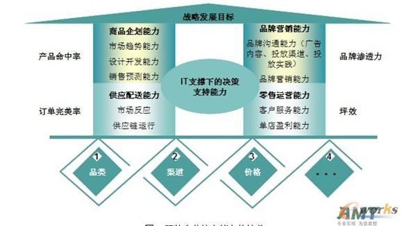 AMT咨詢認(rèn)為,服裝企業(yè)信息化規(guī)劃首先要明確企業(yè)戰(zhàn)略定位和核心能力,如圖1。企業(yè)核心能力的培養(yǎng)決定了信息化的焦點(diǎn)和步驟,信息化戰(zhàn)略必須要為公司的發(fā)展戰(zhàn)略服務(wù),如對(duì)于致力于打造強(qiáng)勢(shì)服裝品牌的企業(yè)來(lái)說,就需要對(duì)消費(fèi)者有所研究,了解消費(fèi)者的細(xì)分市場(chǎng)是怎樣一個(gè)情況。有了細(xì)分市場(chǎng)之后,企業(yè)才能對(duì)這樣一個(gè)細(xì)分的消費(fèi)群體有一個(gè)明確的目標(biāo),從而確定應(yīng)該去設(shè)計(jì)生產(chǎn)什么樣的商品,并以此來(lái)組織整個(gè)供應(yīng)鏈的運(yùn)作。因此對(duì)于品牌商,信息化的需求重點(diǎn)在于如何有效地獲取終端市場(chǎng)的信息,并在此基礎(chǔ)上進(jìn)行有效的消費(fèi)者分析,從而提供對(duì)產(chǎn)品策劃和市場(chǎng)營(yíng)銷的支持,因此以目標(biāo)消費(fèi)者為核心的終端數(shù)據(jù)和客戶關(guān)系管理是信息化的重點(diǎn)。