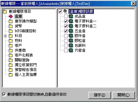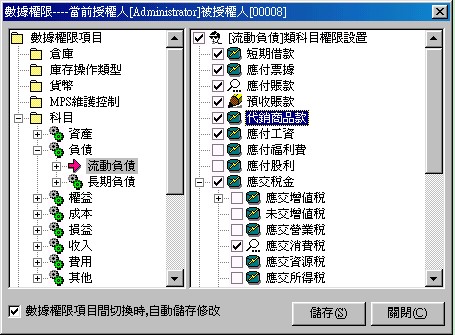 1. 在界面左邊的樹(shù)控件中選擇要進(jìn)行修改數(shù)據(jù)權(quán)限項(xiàng)﹐系統(tǒng)自動(dòng)在右邊的樹(shù)中刷新出數(shù)據(jù)權(quán)限項(xiàng)所對(duì)應(yīng)的所選操用員所擁有的有的數(shù)據(jù)權(quán)限。數(shù)據(jù)權(quán)限的授與各取消操作方式同菜單權(quán)限的操作方式一致。當(dāng)在數(shù)據(jù)類(lèi)別之切換時(shí)﹐系統(tǒng)根據(jù)界面下部的選擇框的設(shè)定決定由系統(tǒng)自動(dòng)保存上一數(shù)據(jù)類(lèi)別的修改還是提示用戶(hù)手工保存。