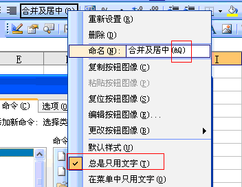 第一步,單擊工具——自定義,在自定義模式下,右擊工具欄上的合并單元格圖標(biāo),勾選“總是只用文字”。