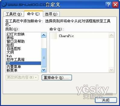 在如圖界面中將“命令”下邊列表框中的“CharuPic”宏拖動(dòng)到工具欄中的任意位置,松開鼠標(biāo)后,在工具欄上就會(huì)出現(xiàn)一個(gè)名為“CharuPic”的按鈕,右擊該按鈕,在出現(xiàn)的右鍵菜單中,將按鈕的名稱修改為“批量插入背景圖片”;在“更改按鈕圖像”子菜單中選擇自己喜歡的圖片作為按鈕的背景,最后關(guān)閉“自定義”對(duì)話框。