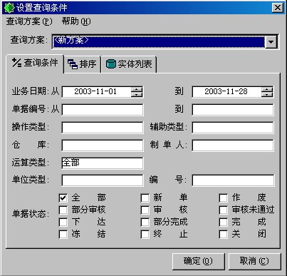 庫存單據(jù)提供了多種查詢條件,如下圖: