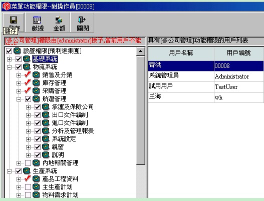 左邊的功能圖示可以分為三部(a.)此圖示中左邊的 ‘+’ 號表示功能項’承運及保險公司’不是最未一級功能項﹐它還有子項可以展開﹐功能項的控制方式采用樹型級連控制方式﹐只有擁有了上一級功能權(quán)限﹐才可能擁有并使用下一級功能 (b.) 中間的小勾
