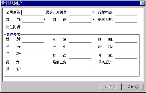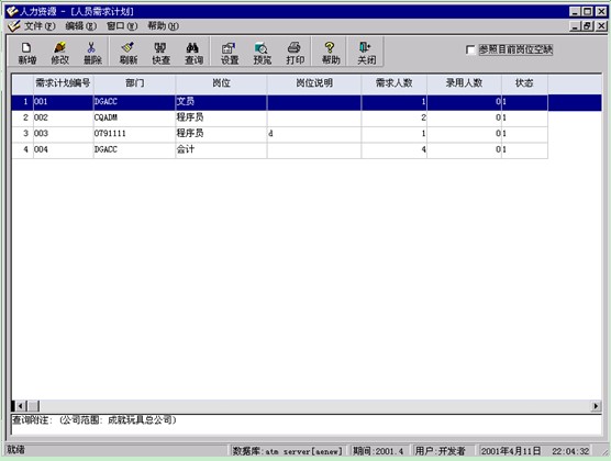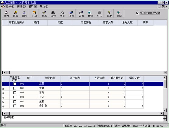要求、時間要求等,通過菜單“新增”錄入各部門的人員需求