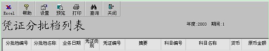 憑證分批檔列表是將指定的某個期間的、某個分批檔中的有所有憑證的明細數(shù)數(shù)列出。此模塊只有查詢功能。憑證分批檔列表如圖2-14所示.