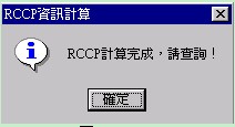 3.點(diǎn)“計(jì)算”按鈕在彈出的“RCCP資訊運(yùn)算”視窗中,點(diǎn)“運(yùn)算”按鈕,運(yùn)算完成時(shí)出現(xiàn)以下圖3-3-5-1提示: