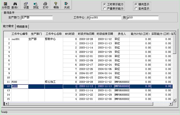 4.點(diǎn)“負(fù)荷”按鈕進(jìn)入“RCCP綜合能力分析”介面,在“生產(chǎn)部門”欄和“工作中心”欄中選擇相應(yīng)的值,在選擇是“工時(shí)表示能力”還是“產(chǎn)量表示能力”,橫向顯示或豎向顯示后;點(diǎn)“查詢”按鈕即可查出主生產(chǎn)計(jì)劃方案的能力負(fù)荷。如點(diǎn)“分析圖”按鈕則可以查看用圖形表示的負(fù)荷情況。RCCP綜合能力分析”介面如下圖3-3-5-2: