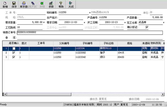 2、 如圖3-23-1所示 ,選取待加工的物料,鍵入需求數(shù)量、需求日期、開(kāi)工日期、生產(chǎn)批次及備注,選取工藝路線號(hào)、完工倉(cāng)庫(kù),將游標(biāo)放在上述的任一輸入框內(nèi),點(diǎn)滑鼠右鍵,在彈出的功能表框中點(diǎn)展開(kāi)到下一層功能表?xiàng)l,可將待加工的物料的子料展開(kāi)到表單的子料明細(xì)表體里,并可根據(jù)實(shí)情調(diào)整子料需求數(shù)量、發(fā)料類型、再計(jì)劃數(shù)量、再計(jì)劃完工倉(cāng)庫(kù)、再計(jì)劃路線、子料需求日期、計(jì)劃開(kāi)工日期、備注等列中的資料。待檢查進(jìn)入的資料正確后,點(diǎn)保存按鈕,若輸入的資料完整且無(wú)一致性沖突,系統(tǒng)就會(huì)按當(dāng)時(shí)的已有工單編號(hào)狀況及工單編號(hào)規(guī)則自動(dòng)為新生成的工單給定一個(gè)編號(hào)且保存該工單。這樣就完成了零星工單的錄入。