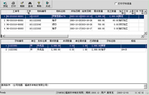3.選擇是否打印子料的資訊;點(diǎn)“預(yù)覽”、“列印”按鈕即可列印工單。
