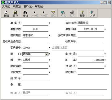 在退款單項(xiàng)目,打開(kāi)退款單信息資料,選擇一種退款單類型即可退款類型由系統(tǒng)給出,用戶不可以維護(hù)。 |