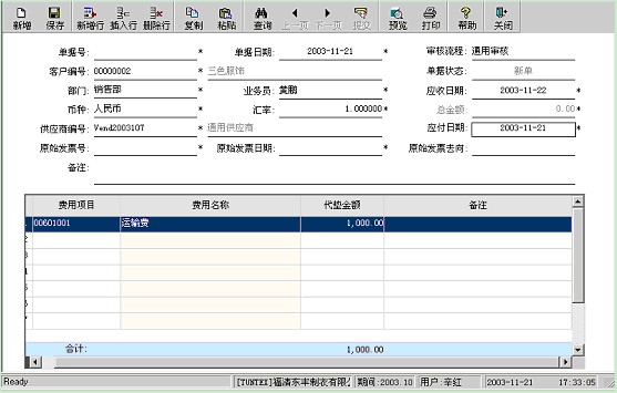 代墊費(fèi)用發(fā)票上的金額,用戶手工錄入 |