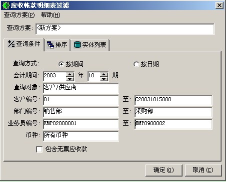 查詢方式有兩種:移至、查詢。查詢如圖4-9所示。界面上給出的查詢條件查詢方式 會計期間、查詢對象、客戶編號、部門編號、業(yè)務員編號 、貨幣、是否包含無票就款。系統(tǒng)默認的查詢條件是查詢方式按期間進行、當前期間、第一個是客戶(按客戶編號順序)、不包含無票應收款的應收賬款發(fā)生情況。您可以將系統(tǒng)給出的查詢條件根據(jù)需要任意組合,得到您要的查詢結果,請參見《公共操作手冊》’中的相關內容。