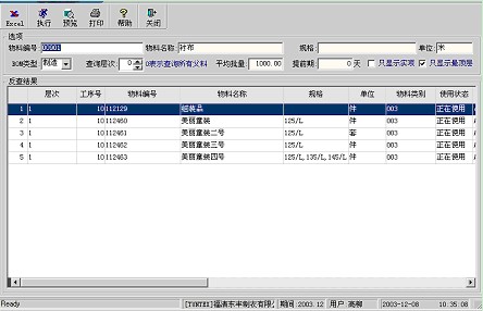 與產(chǎn)品結(jié)構(gòu)正查功能使用類似,不過(guò)產(chǎn)品結(jié)構(gòu)反查是根據(jù)子項(xiàng)查詢它的父項(xiàng)(直接父項(xiàng)和間接父項(xiàng))。本功能主要用于有多個(gè)父項(xiàng)用到同一子項(xiàng)或有多級(jí)父項(xiàng)而需要知道有哪些父項(xiàng)時(shí),本功能在設(shè)計(jì)及生產(chǎn)制造過(guò)程中均為一個(gè)極為便利的查詢工具。子項(xiàng)物料為普通物料且按制造